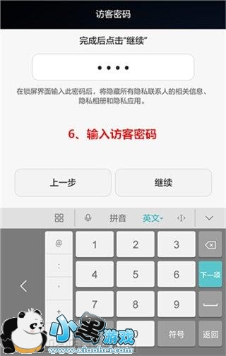 操作步骤六:填写“访客密码”,这个密码是别人可任意查看的密码,比如手机借给其他人可以告诉他这个密码,我设置成了:4321