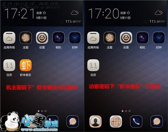 我使用访客密码:4321打开手机时,主屏上的虾米音乐已不见了。如果我使用机主密码:1234打开手机时,主屏上的虾米音乐又会出现。同理,我们也可以利用这个功能隐藏相册和电话号码,再也不用担心小秘密被妈妈删掉了。