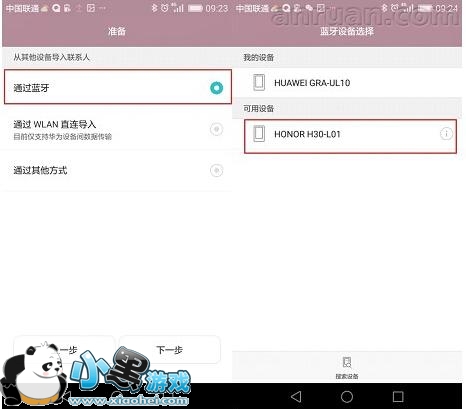 选择通过蓝牙,选择下一步之后,手机蓝牙会智能自动开启,并搜寻可用设备。这时,只要保证旧手机的蓝牙开启,并且处于可被发现的状态,不一会就可以被P8搜索到了。注意可用设备的名称与旧手机的蓝牙名称是否相符,确认无误后,选择搜索到的旧手机,这时旧手机就会自动弹出提示是否允许P8访问联系人等信息,点是之后就可以进行联系人的传输了,非常方便。