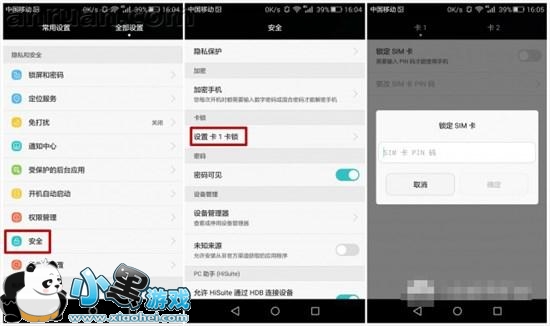 设置——安全——设置卡锁,PIN码是SIM的个人识别密码。手机的PIN码是SIM卡的一种安全措施,防止别人盗用SIM卡,如果启用了开机PIN码,那么每次开机后就要输入4位数PIN码。在输入三次PIN码错误时,手机便会自动锁卡,并提示输入PUK码解锁,需要使用服务密码拨打运营商客服热线,客服会告知初始的PUK码,输入PUK码之后就会解锁PIN码。