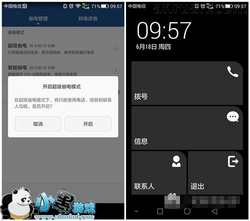 打开手机管家,省电管理,选择超级省电,此时手机只剩下电话和短信功能,其它一切功能都无法使用,并且降低CPU的功耗,极致省电,楼主测试,10%电量用半天基本没问题(有电话,短信),这就是华为智电省电系统。