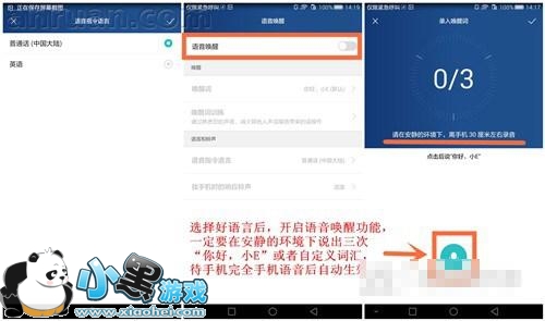 PS:首次使用,需选择语言类型,然后在安静的环境下离手机30厘米左右录音,点击麦克风标志即可录制类似“你好,小E”,或者自定义唤醒词,开启后,即使黑屏状态下呼叫自定义语音词汇,手机即可响起亮屏,这里就不详细介绍了,有兴趣的自己可以去尝试。