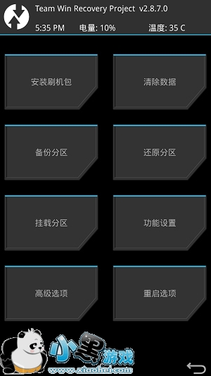 之后你的手机会进入twrp版的recovery界面。