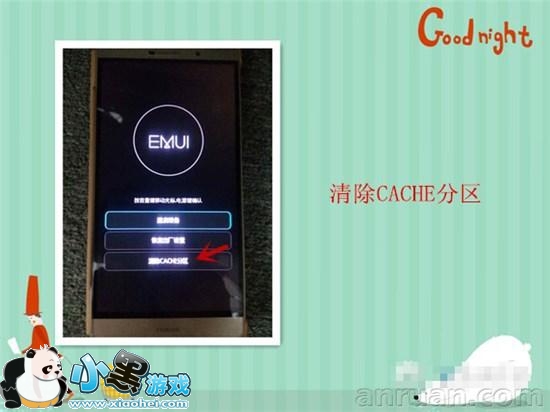 3)、按音量下键选择第三条“清除CACHE分区”,按电源键确认。