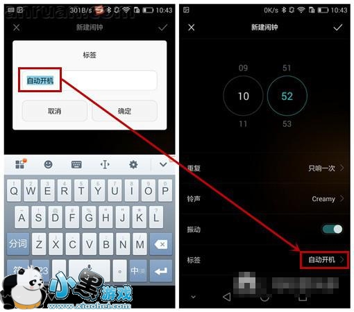 打开闹钟——>选择新建闹钟——>设置好闹铃的时间,现在时间是10:52,闹钟调至11:00,再把标签改为“自动开机”。