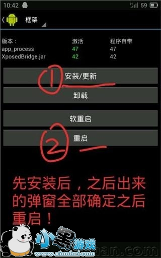 安装上面的工具,安装的顺序为 Xposed框架_2.5.1 、 Greenify (Donation Package)_2.3、Greenify_2.3 (build 10)、Titanium Backup MoDaCo v7.2.2 直装修改版(可以不装)打开安装完毕的 xposed ,允许 ROOT 权限!点击 “框架” , 按照下图操作。