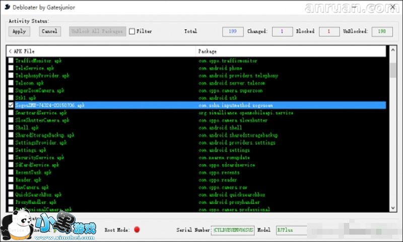 用Debloater软件删除的APP还可借助该软件恢复,方法是点击Read Device packages 获取设备上安装的应用列表后,找到删除的软件,去掉勾选再点击Apply按钮。如果真的出现误删文件无法开机的问题,可以进入Recovery刷入完整的ROM包解决。