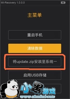 如果方法一不行我们只能到小米的官方下载刷机包了,这种办法比上面复杂了是实在解决了不了我们再操作,具体是进入到小米官方,然后找到与自己手机型号一样的刷机包存储到你小米手机的SD卡上,接着我们按“开机键和音量放大键”然后进入如下界面选择我们框的选项即可刷新系统了。