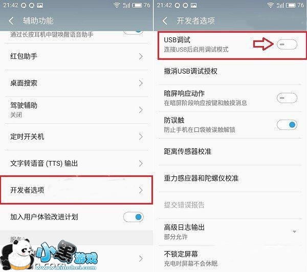 第二步:继续进入魅蓝E设置中的的「开发者选项」->「USB调试」。默认这个USB调试是关闭的,点击开启就可以了。