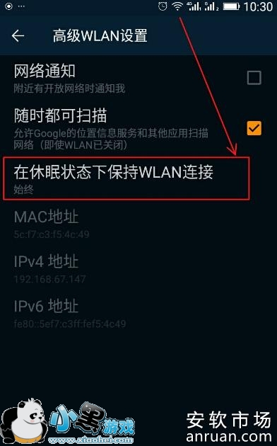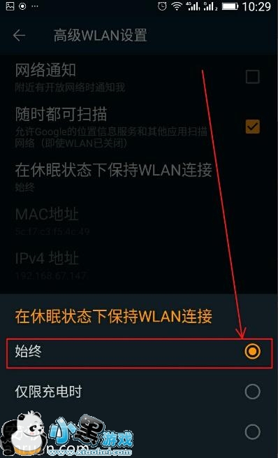6、返回到高级WLAN设置界面,可以看到现在的状态变成了“始终”,这样也就标识设置成功了。