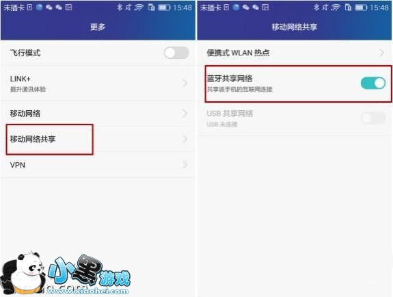 当两部手机连接后,进入“设置”—更多—移动网络共享—然后开启“蓝牙共享网络”(必须是两部手机同时开启该功能),如图所示: