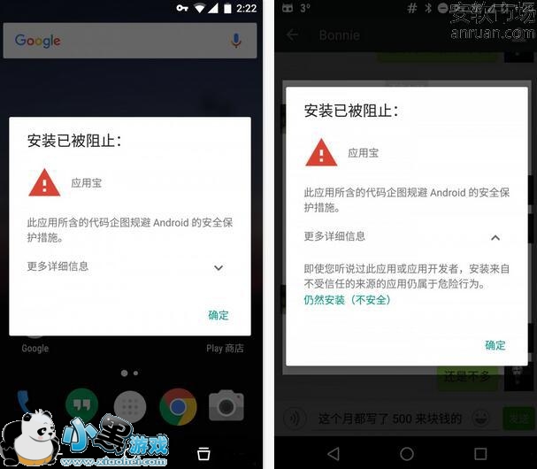 以下结论都是以手机中安装有 Google 服务为前提的;Google Play Store 的「定期检查应用潜在危害」功能阻止了「拔粪宝」的后台自动安装;这个功能不仅会阻止后台安装,事实上,当我们尝试手动安装「拔粪宝」及其同类时,这个警告都会出现;