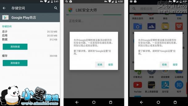 为了证实这个猜想,我前往应用列表中清除了 Google Play Store 的应用数据,这样便能尽可能地还原当初刚登陆 Google 账号之后的情形。然后我随意下载了一个应用,手动安装时果然弹出了这个「定期检查应用潜在危害」的通知。