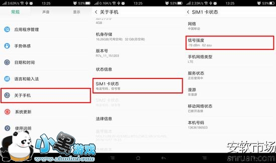 当满足以上三个条件后,进入设置--关于手机--SIM卡状态,查看信号强度的数值。