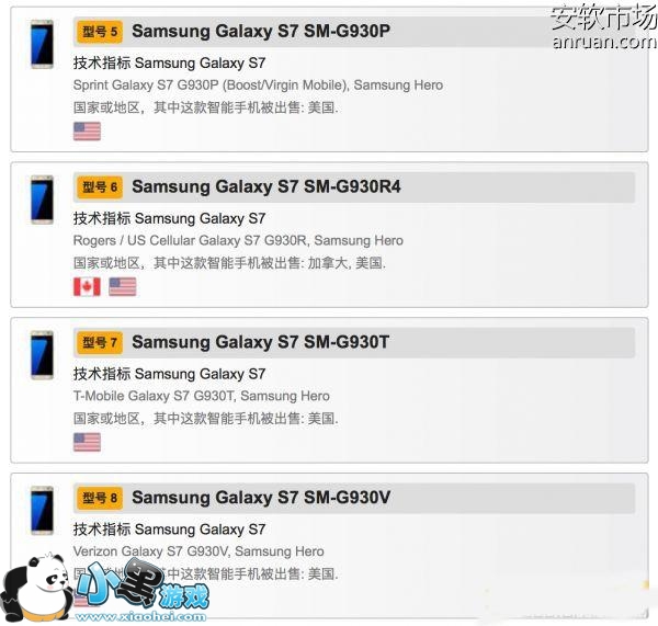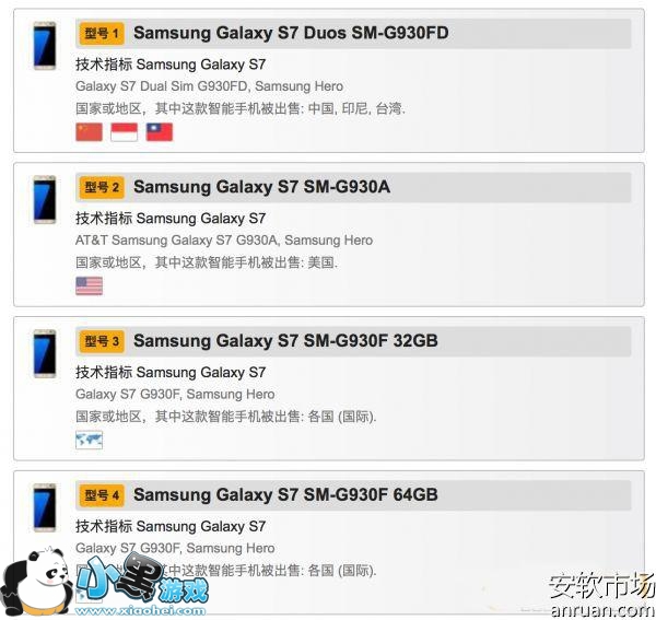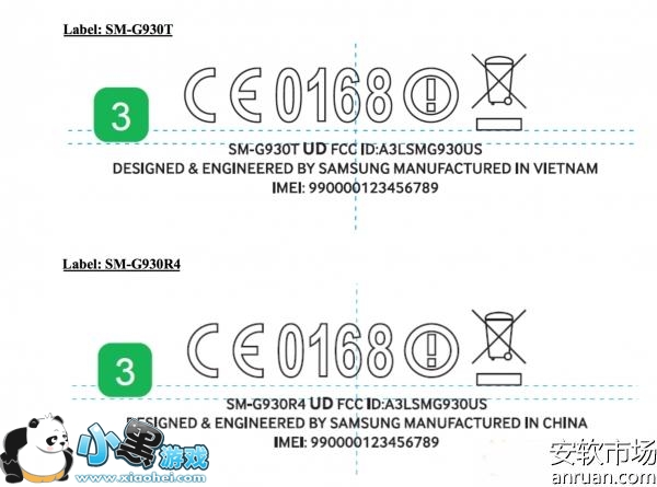 Samsung GALAXY S7 从美国 FCC 认证得知型号有 SM-G930V、SM-G930A、SM-G930T、SM-G930R4 以及 SM-G930P;其中 SM-G930V 与 SM-G930A 制造产地在韩国,SM-G930P 与 SM-G930T 在越南,至于 SM-G930R4 则是在中国生产。