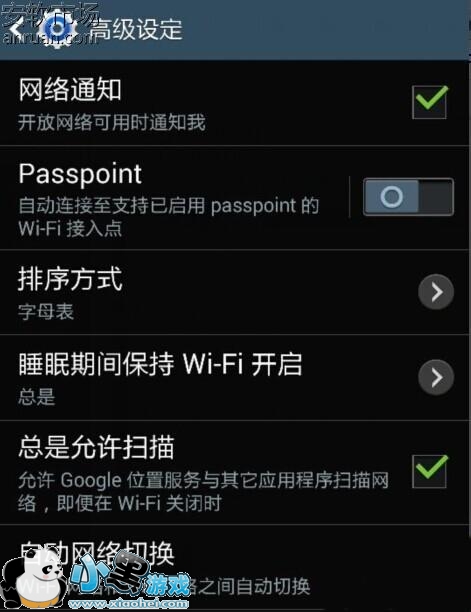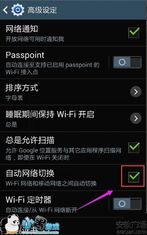 2、进入WIFI高级设置界面后找到网络自动切换功能。