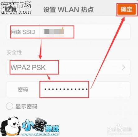 3、最后只需要我们设置好对应的ssid和wifi加密模式和密码,点击右上角的确定就可以成功开启热点,