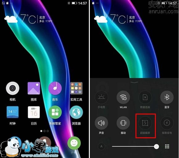 另外金立S6运行的是Amigo 3.1用户界面,该系统有点不点不同在于需要向上滑动屏幕调出快捷开关界面,在其界面即可看到【超级截屏】快捷开关,点击一下即可截屏,这种方法也是非常简单方便的,如下图所示: