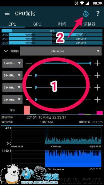 3:如图设置(第一个最高1.44ghz、后面三个全部最低384mhz),其他项保持原样