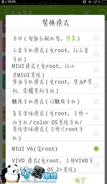 2、字体管家下载好自己喜欢的字体,替换模式选择miui v6(需root),先不要替换。