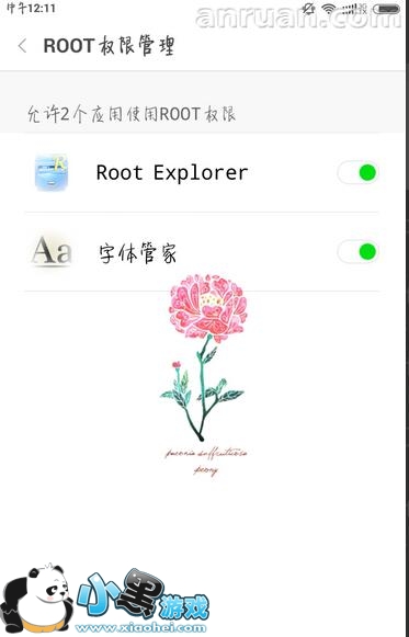 3、打开小米手机安全中心,选择授权管理,选择root权限管理,允许字体管家和re管理器使用root权限。