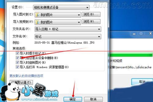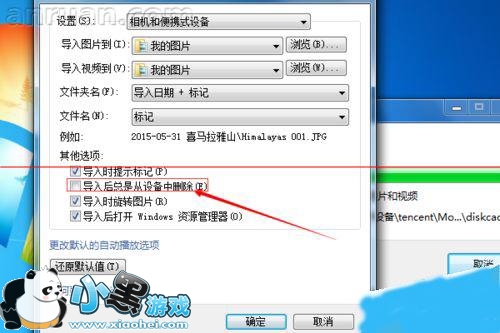 3、在导出设置窗口中有一项是没有点选对号的,就是我们要选择的项:导出后总是从设备中删除。
