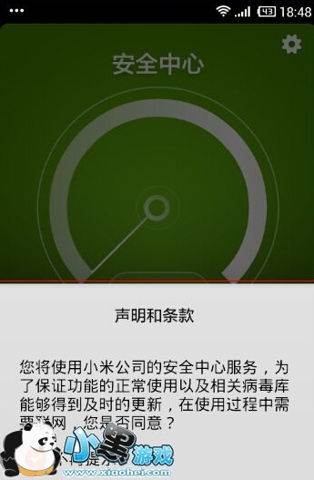 2、打开安全中心界面,在弹出的 声明和条款 对话框上点击 确实 按钮