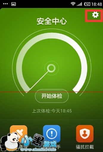 5、当然,我们自己也可以设置被拦截的短信或者来电规则。在安全中心的右上角点击 设置 图标。