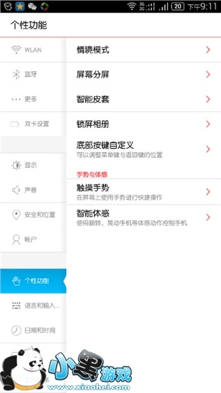 为了提高手机的可玩性,为用户提供更多的使用乐趣,在个性功能中还提供了多种手势与体感应用。具体看以下打开方法: