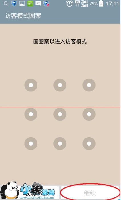 5、接下来是一个非常关键的步骤,我们需要为”访客“设定不同的屏幕解锁模式。如示例中是地图形方式解锁屏幕的。注意一定要保证”访客“屏幕与主屏幕的解锁图案不一样,设置完成后,点”继续“保存配置。这样在屏幕锁定的情况下,使用不同的解锁图案,就会进入相应的桌面。