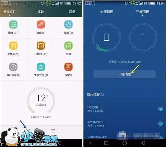 在这里,我们可以很轻松的清理**,释放手机内存空间。打开文件管理器,主页面有一个类似钟表的刻度盘,点击页面下方的【清理缓存】