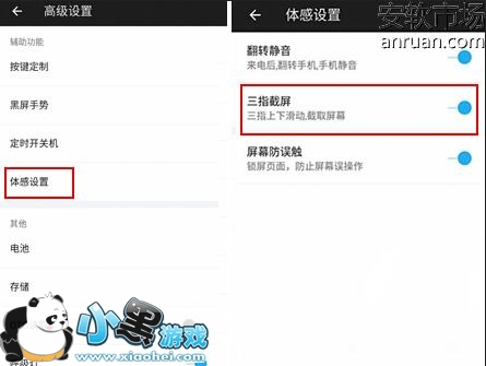 一加手机X运行的是Hos2自主开发系统,手机内部三指截屏功能,小编的手机是默认开启这个功能。但是如果你拿到的手机没有这个功能,你就需要自己手动设置。具体的操作方法是:先进入到【设置】---【高级设置----【体感设置】----【三指截屏】,开启开关即可。如下图所示: