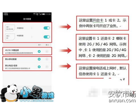 4.根据你的实际需要,可以分别对卡 1 和卡 2 进行设置。比如你可以选择哪张卡使用4G业务。