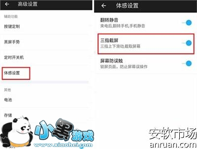 一加手机X运行的是氢OS系统,手机内置了三指截屏功能,而需要使用该功能前提是要开启这个功能。具体的操作方法是:先进入到【设置】---【高级设置----【体感设置】----【三指截屏】开启旁边的开关即可,如下图所示: