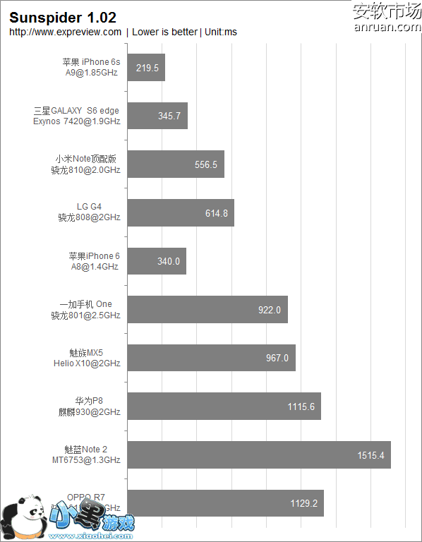 CPU性能对比(SunSpider脚本性能对比,单位:ms,时间短说明处理速度快)