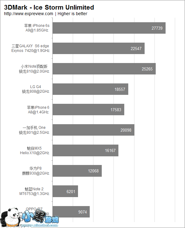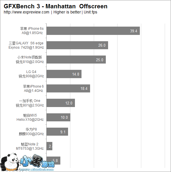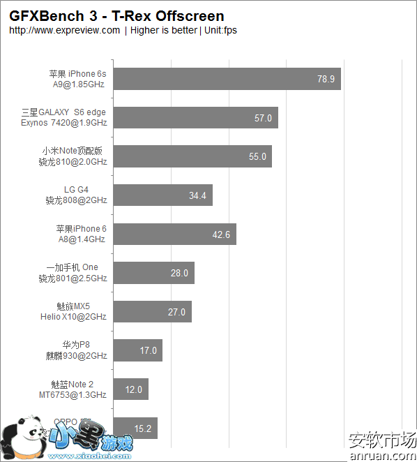 GPU性能对比(GFXbench3-Rex Offscreen帧数对比,单位:fps,分数仅供参考,越高GPU性能越强)