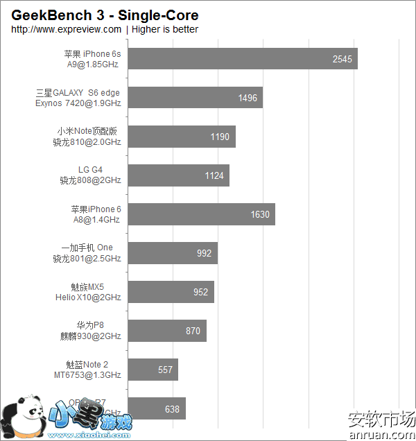 Geekbench3单核跑分对比(分数越高处理能力越强)