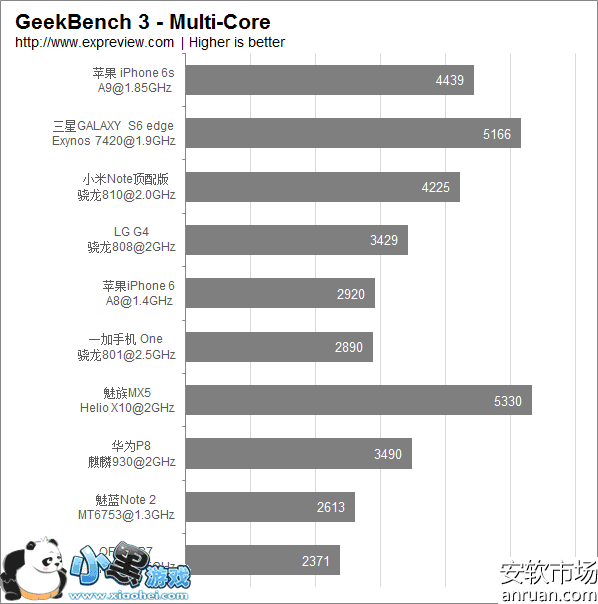 Geekbench3多核跑分对比(分数越高处理能力越强)