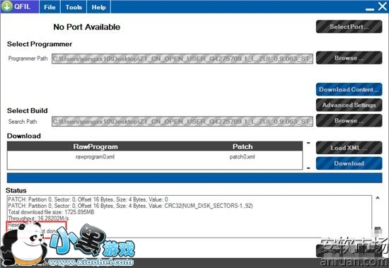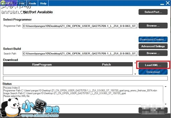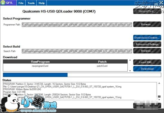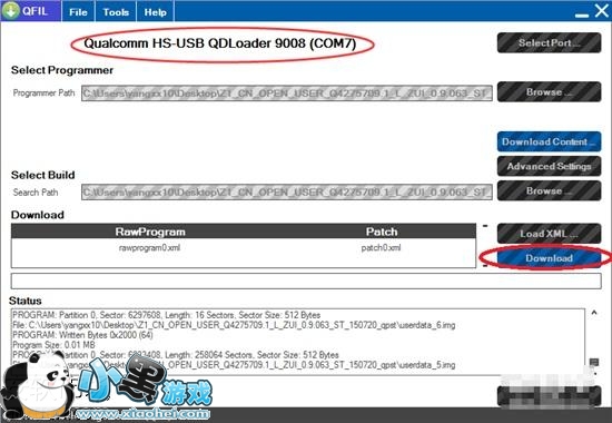 5.点击Download下面的Load XML,软件会识别对应刷机包里的“rawprogram0”及“patch0”文件,据此刷机文件准备完毕。