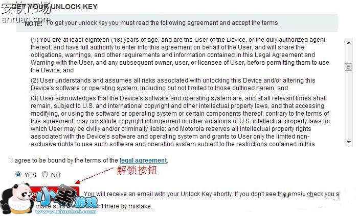 点击红色按钮,如果你的手机能解锁,就会在网页下方出现获得解锁密钥的按钮。记得选择YES同意条款。再确定后即可获得密钥。密钥会已邮件形式发送到你此帐号的邮箱里。