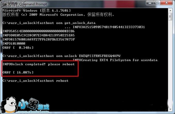 例如:你的密钥是:12345678,那么就输入: fastboot oem unlock 12345678回车后,即解锁成功,如下图。可以放心的刷入其他系统刷机包了。