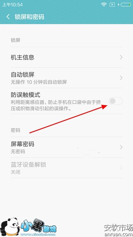 3、最后在锁屏和密码界面下方看到【防误触模式】选项,点击旁边的按钮关闭即可,如下图所示: