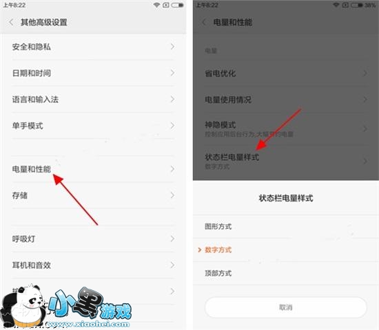 二、然后在红米Note3的“其他高级设置”设置中,我们再点击进入【电量和性能】设置,之后找到并点击【状态栏电量样式】,选择【数字方式】之后,我们就会发现此时红米Note3电池电量以百分比的形式显示了,如下截面图所示。