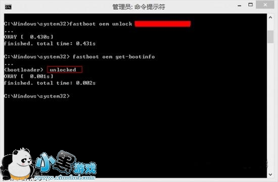输入 fastboot oem get-bootinfo,提示,unlocked,说明已经解锁成功,这样我们就可以换REC,然后刷第三方ROM了。