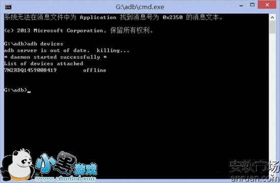 若无论如何操作都提示offline,请把任何可能连接手机占用ADB进程的软件关掉,最典型的目前有QQ,各类助手。大家自行排查。若提示如下,则右键任务管理器,找到CMD,右键结束进程,或者重新一下电脑,CMD窗口不能重复开启,有些系统关闭后不会自动把进程结束掉。