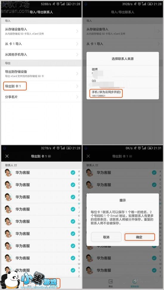 ②选择导出到卡一→选择联系人来源→选择手机→全选→导出→确定
