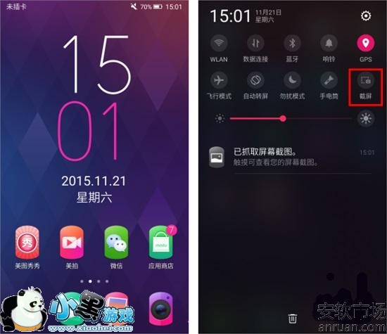 美图V4运行的是MEI OS 2.5系统,所以还有一种截屏方法就是下拉菜单进行截图,这和目前市场面大多数国产智能手机一样的下拉菜单内置快捷截屏工具,用手指将屏幕向下滑动一下看到【截屏】字样点击一下便可截图,如下图所示: