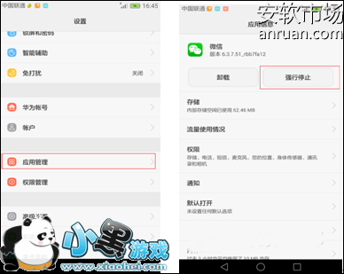 2、设置->应用管理->微信,检查强制停止是否是可点击(非灰色)。如果不可点击(灰色)时,说明微信没有运行,请重新打开微信,微信正常运行时即可分享。