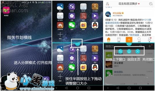 除此之外有几个使用窍门:①按住屏幕中间小圆圈上下拖动可以调整窗口大小;②点击中间小圆圈有切换上下窗口、返回主页、关闭窗口选项。