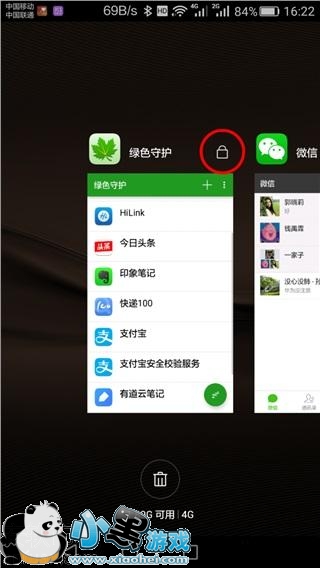 七、点一下虚拟按键中的那个小方块按钮,会弹出后台应用列表,在绿色守护上往下拉一下,就锁住绿色守护应用了,这样点清除后台应用按钮时,绿色守护因为被锁,所以不会清除。